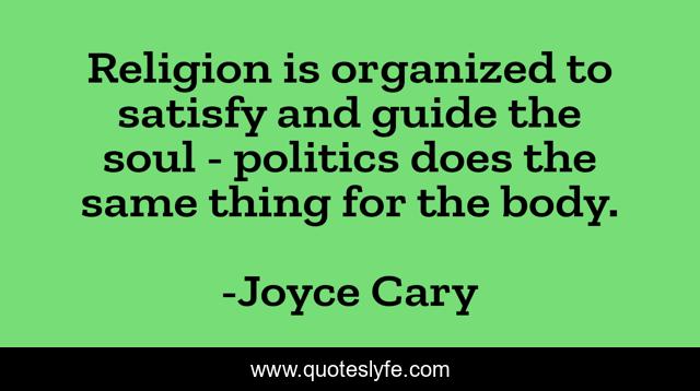 This page presents the quote "Religion is organized to satisfy and guide the soul - politics does the same thing for the body.". Author of this quote is Joyce Cary. This quote is about body, politics, soul,.