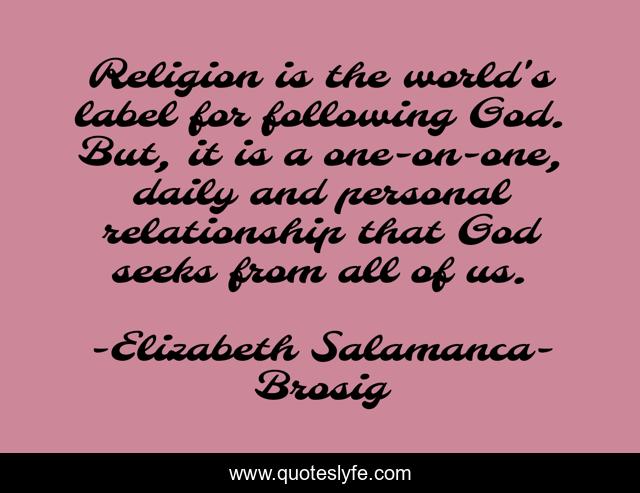 This page presents the quote "Religion is the world's label for following God. But, it is a one-on-one, daily and personal relationship that God seeks from all of us.". Author of this quote is Elizabeth Salamanca-Brosig. This quote is about inspirational-religious, christianity,.