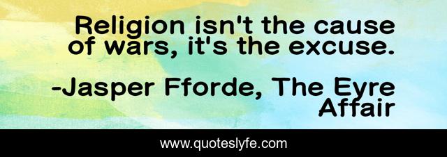 This page presents the quote "Religion isn't the cause of wars, it's the excuse.". Author of this quote is Jasper Fforde, The Eyre Affair. This quote is about religion, war,.