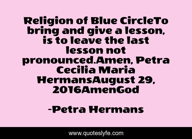 This page presents the quote "Religion of Blue CircleTo bring and give a lesson, is to leave the last lesson not pronounced.Amen, Petra Cecilia Maria HermansAugust 29, 2016AmenGod". Author of this quote is Petra Hermans. .