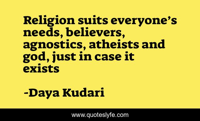 This page presents the quote "Religion suits everyone’s needs, believers, agnostics, atheists and god, just in case it exists". Author of this quote is Daya Kudari. This quote is about atheism, god, religion,.