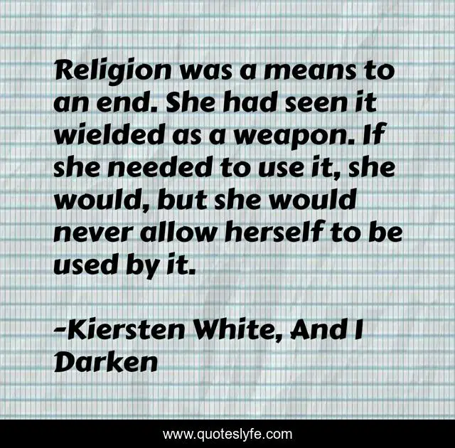 This page presents the quote "Religion was a means to an end. She had seen it wielded as a weapon. If she needed to use it, she would, but she would never allow herself to be used by it.". Author of this quote is Kiersten White, And I Darken. This quote is about religion, power,.