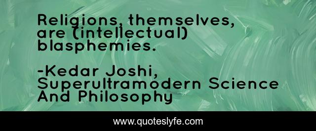 This page presents the quote "Religions, themselves, are (intellectual) blasphemies.". Author of this quote is Kedar Joshi, Superultramodern Science And Philosophy. This quote is about blasphemy, thinking, critical-thought, intellectual,.