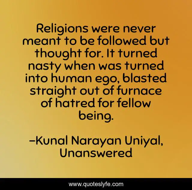 This page presents the quote "Religions were never meant to be followed but thought for. It turned nasty when was turned into human ego, blasted straight out of furnace of hatred for fellow being.". Author of this quote is Kunal Narayan Uniyal, Unanswered. .