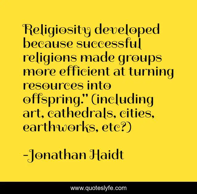 This page presents the quote "Religiosity developed because successful religions made groups more efficient at turning resources into offspring." (including art, cathedrals, cities, earthworks, etc?)". Author of this quote is Jonathan Haidt. This quote is about atheism, religion,.