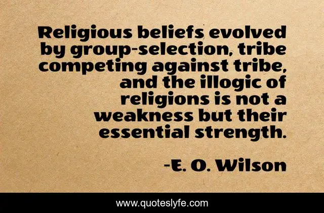 This page presents the quote "Religious beliefs evolved by group-selection, tribe competing against tribe, and the illogic of religions is not a weakness but their essential strength.". Author of this quote is E. O. Wilson. This quote is about weakness, beliefs, competing,.
