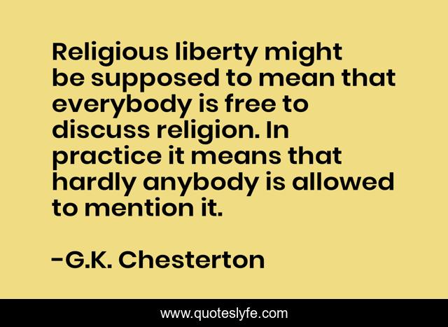 This page presents the quote "Religious liberty might be supposed to mean that everybody is free to discuss religion. In practice it means that hardly anybody is allowed to mention it.". Author of this quote is G.K. Chesterton. This quote is about religion, freedom-of-religion,.