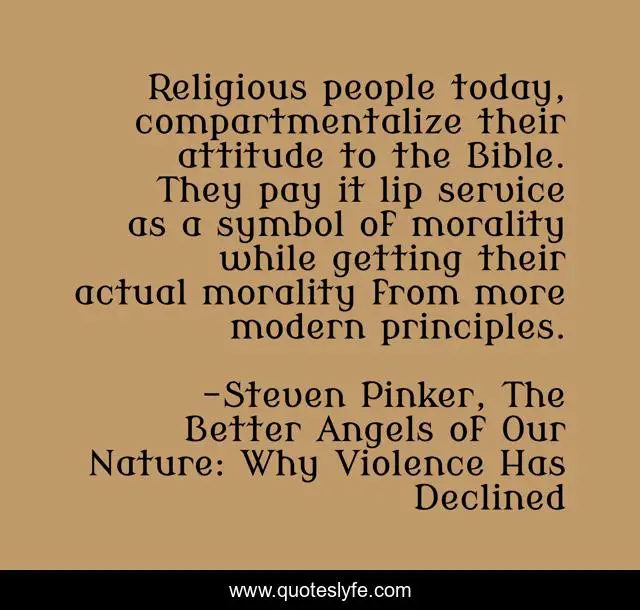 This page presents the quote "Religious people today, compartmentalize their attitude to the Bible. They pay it lip service as a symbol of morality while getting their actual morality from more modern principles.". Author of this quote is Steven Pinker, The Better Angels of Our Nature: Why Violence Has Declined. This quote is about religioun, morality,.