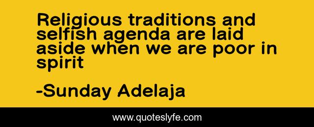 This page presents the quote "Religious traditions and selfish agenda are laid aside when we are poor in spirit". Author of this quote is Sunday Adelaja. This quote is about poor, selfish, traditions, agenda, religious, spirit,.