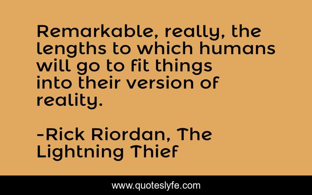 This page presents the quote "Remarkable, really, the lengths to which humans will go to fit things into their version of reality.". Author of this quote is Rick Riordan, The Lightning Thief. This quote is about human, version-of-reality,.