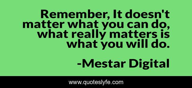 This page presents the quote "Remember, It doesn't matter what you can do, what really matters is what you will do.". Author of this quote is Mestar Digital. This quote is about enthusiasm, inspirational,.