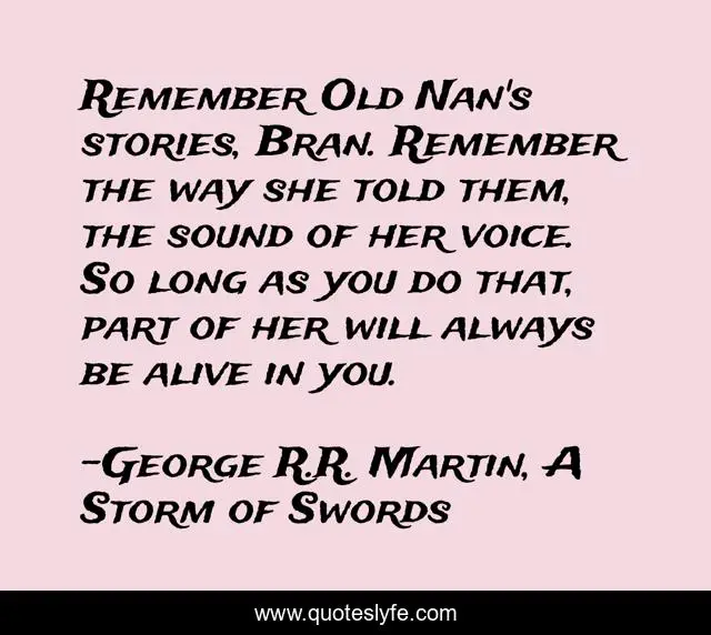 This page presents the quote "Remember Old Nan's stories, Bran. Remember the way she told them, the sound of her voice. So long as you do that, part of her will always be alive in you.". Author of this quote is George R.R. Martin, A Storm of Swords. This quote is about enthusiasm, grieving, stories, children, inspirational,.