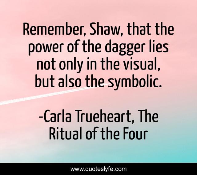This page presents the quote "Remember, Shaw, that the power of the dagger lies not only in the visual, but also the symbolic.". Author of this quote is Carla Trueheart, The Ritual of the Four. This quote is about fantasy, young-adult-fiction, paranormal,.
