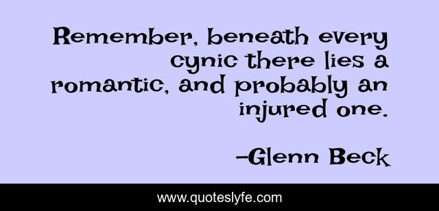 This page presents the quote "Remember, beneath every cynic there lies a romantic, and probably an injured one.". Author of this quote is Glenn Beck. This quote is about remember, cynic,.