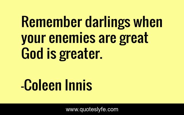 This page presents the quote "Remember darlings when your enemies are great God is greater.". Author of this quote is Coleen Innis. This quote is about god, confidence, motivational, optimistic, positive,.