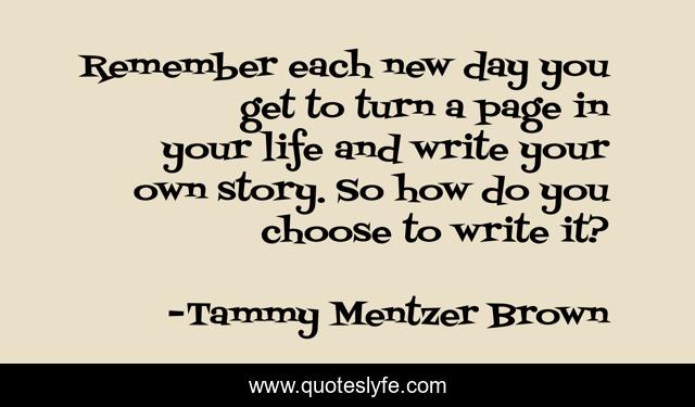This page presents the quote "Remember each new day you get to turn a page in your life and write your own story. So how do you choose to write it?". Author of this quote is Tammy Mentzer Brown. This quote is about write, life, story, turn-page, choose,.