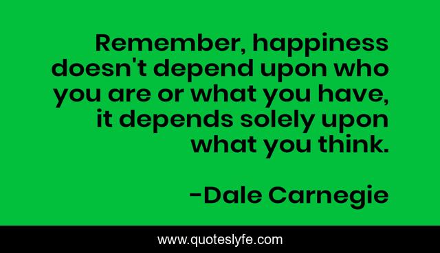 This page presents the quote "Remember, happiness doesn't depend upon who you are or what you have, it depends solely upon what you think.". Author of this quote is Dale Carnegie. .