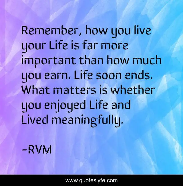 This page presents the quote "Remember, how you live your Life is far more important than how much you earn. Life soon ends. What matters is whether you enjoyed Life and Lived meaningfully.". Author of this quote is RVM. This quote is about motivation, inspiration,.
