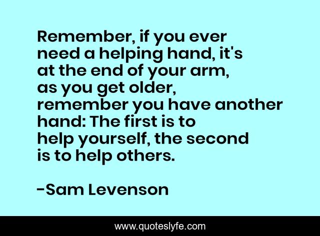 This page presents the quote "Remember, if you ever need a helping hand, it's at the end of your arm, as you get older, remember you have another hand: The first is to help yourself, the second is to help others.". Author of this quote is Sam Levenson. This quote is about compassion, enthusiasm, inspirational, misattributed-audrey-hepburn,.