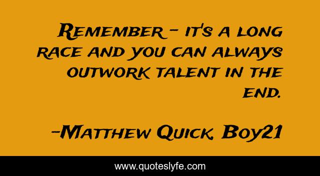 This page presents the quote "Remember – it's a long race and you can always outwork talent in the end.". Author of this quote is Matthew Quick, Boy21. This quote is about life, talent, school, hard-work, sports,.
