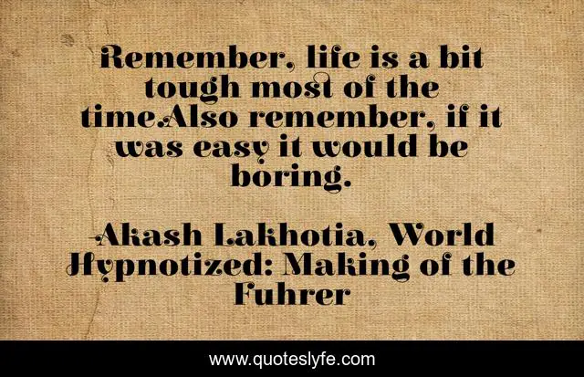 This page presents the quote "Remember, life is a bit tough most of the time.Also remember, if it was easy it would be boring.". Author of this quote is Akash Lakhotia, World Hypnotized: Making of the Fuhrer. This quote is about thoughtsandfeelings, life, literature, meaningoflife, neverregret, change, thoughtbubble, meaningful, meaning,.
