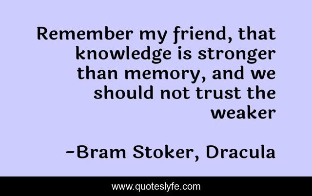 This page presents the quote "Remember my friend, that knowledge is stronger than memory, and we should not trust the weaker". Author of this quote is Bram Stoker, Dracula. This quote is about knowledge, memory,.