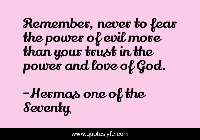 This page presents the quote "Remember, never to fear the power of evil more than your trust in the power and love of God.". Author of this quote is Hermas one of the Seventy. This quote is about fear-of-evil, trust, love, affection,.