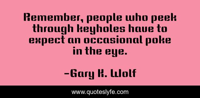 This page presents the quote "Remember, people who peek through keyholes have to expect an occasional poke in the eye.". Author of this quote is Gary K. Wolf. This quote is about keyholes, humor, sarcasm, advice, witty, humor-inspirational, advice-to-beginners,.