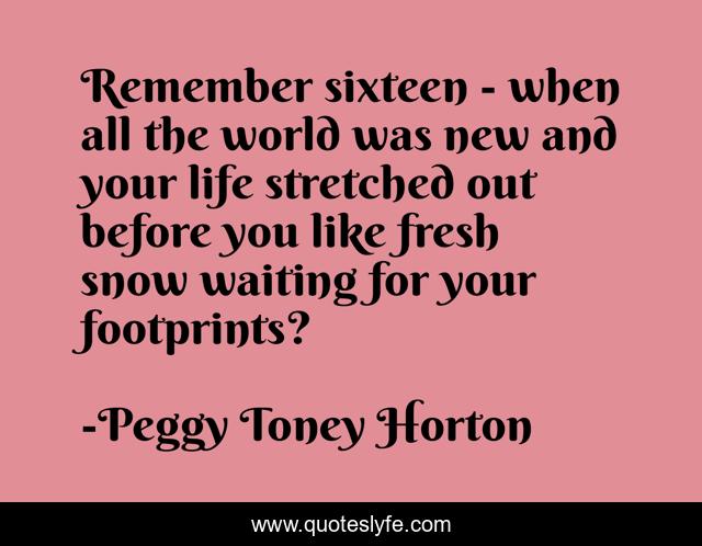 This page presents the quote "Remember sixteen - when all the world was new and your life stretched out before you like fresh snow waiting for your footprints?". Author of this quote is Peggy Toney Horton. This quote is about life, remember, footprints, new, sixteen, fresh-snow,.