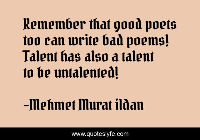 This page presents the quote "Remember that good poets too can write bad poems! Talent has also a talent to be untalented!". Author of this quote is Mehmet Murat ildan. This quote is about poets, good, talent, murat-ildan, talents, poet, untalented,.