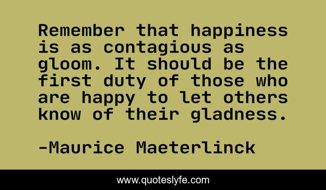 This page presents the quote "Remember that happiness is as contagious as gloom. It should be the first duty of those who are happy to let others know of their gladness.". Author of this quote is Maurice Maeterlinck. .