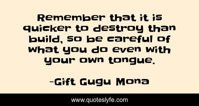 This page presents the quote "Remember that it is quicker to destroy than build, so be careful of what you do even with your own tongue.". Author of this quote is Gift Gugu Mona. This quote is about quicker, remember, build, destroy, tongue, careful,.