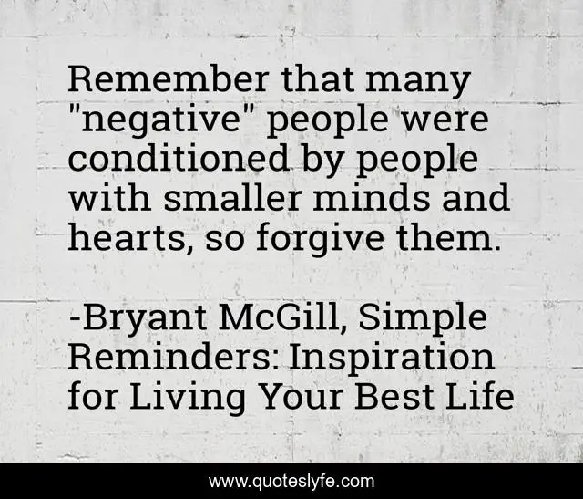 This page presents the quote "Remember that many "negative" people were conditioned by people with smaller minds and hearts, so forgive them.". Author of this quote is Bryant McGill, Simple Reminders: Inspiration for Living Your Best Life. This quote is about forgiveness, negativity, love, conditioning, affection,.