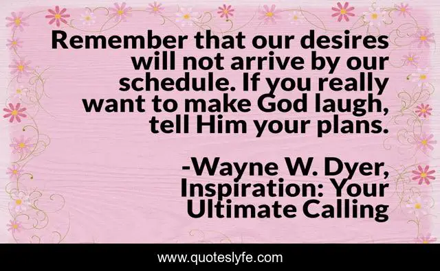 This page presents the quote "Remember that our desires will not arrive by our schedule. If you really want to make God laugh, tell Him your plans.". Author of this quote is Wayne W. Dyer, Inspiration: Your Ultimate Calling. This quote is about desires, time,.