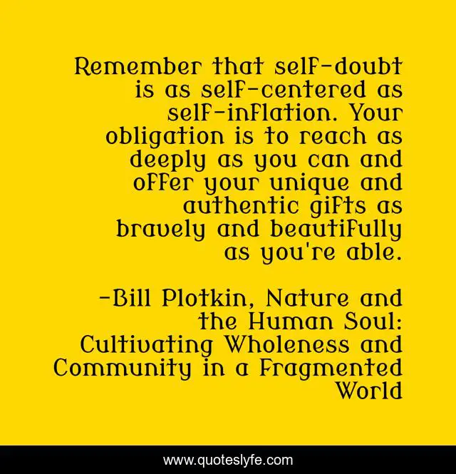 This page presents the quote "Remember that self-doubt is as self-centered as self-inflation. Your obligation is to reach as deeply as you can and offer your unique and authentic gifts as bravely and beautifully as you're able.". Author of this quote is Bill Plotkin, Nature and the Human Soul: Cultivating Wholeness and Community in a Fragmented World. This quote is about spirituality, empowerment, healing,.