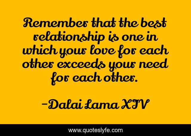 This page presents the quote "Remember that the best relationship is one in which your love for each other exceeds your need for each other.". Author of this quote is Dalai Lama XIV. This quote is about love, affection,.