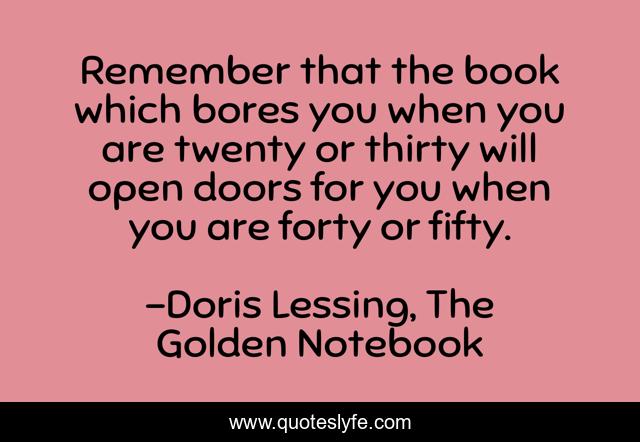 This page presents the quote "Remember that the book which bores you when you are twenty or thirty will open doors for you when you are forty or fifty.". Author of this quote is Doris Lessing, The Golden Notebook. This quote is about age, books, reading,.