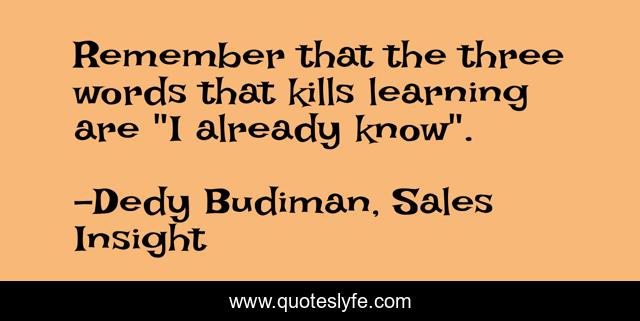 This page presents the quote "Remember that the three words that kills learning are "I already know".". Author of this quote is Dedy Budiman, Sales Insight. This quote is about continuous-learning, learning, self-development, improvement,.