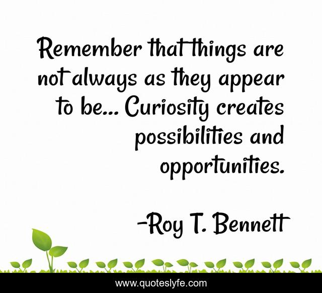 This page presents the quote "Remember that things are not always as they appear to be… Curiosity creates possibilities and opportunities.". Author of this quote is Roy T. Bennett. This quote is about motivation, inspire, optimistic, leaders, living, confidence, positive, creativity, positive-thinking,.