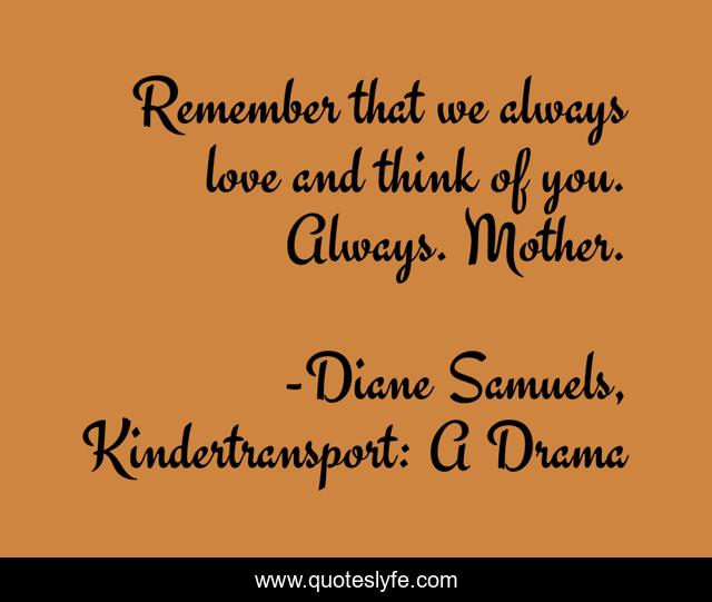 This page presents the quote "Remember that we always love and think of you. Always. Mother.". Author of this quote is Diane Samuels, Kindertransport: A Drama. This quote is about mother-s-love, letters, family, kinder, separation, tragedy-of-life,.
