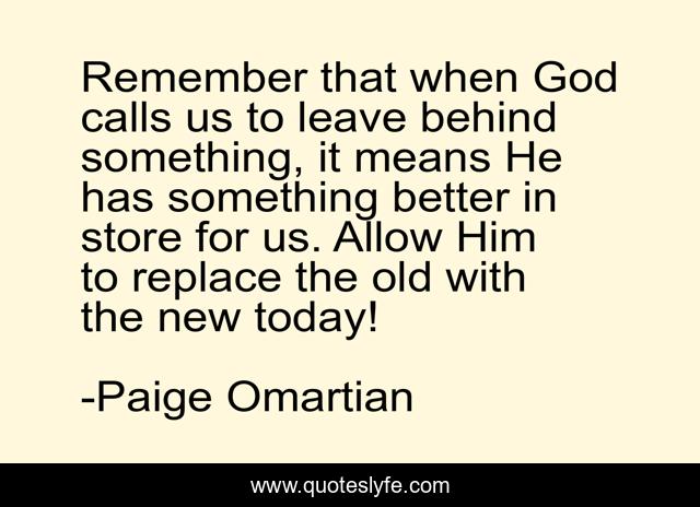 This page presents the quote "Remember that when God calls us to leave behind something, it means He has something better in store for us. Allow Him to replace the old with the new today!". Author of this quote is Paige Omartian. This quote is about faith, god, better, wake-up, inspirational, enthusiasm, trust,.