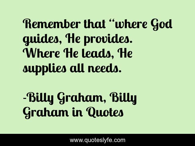 This page presents the quote "Remember that “where God guides, He provides. Where He leads, He supplies all needs.". Author of this quote is Billy Graham, Billy Graham in Quotes. This quote is about god, billy-graham,.