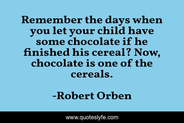 This page presents the quote "Remember the days when you let your child have some chocolate if he finished his cereal? Now, chocolate is one of the cereals.". Author of this quote is Robert Orben. This quote is about funny, old, chocolate, cereal, humor, breakfast, comedy, times,.