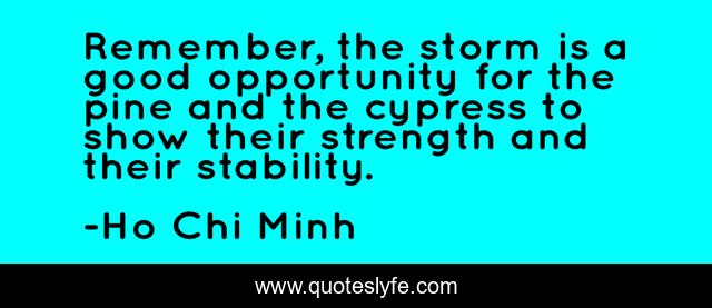 This page presents the quote "Remember, the storm is a good opportunity for the pine and the cypress to show their strength and their stability.". Author of this quote is Ho Chi Minh. This quote is about good, opportunity, storm,.