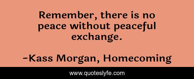 This page presents the quote "Remember, there is no peace without peaceful exchange.". Author of this quote is Kass Morgan, Homecoming. This quote is about peace, diplomacy,.