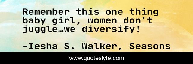 This page presents the quote "Remember this one thing baby girl, women don’t juggle…we diversify!". Author of this quote is Iesha S. Walker, Seasons. This quote is about african-american-authors, chick-lit, romance, fiction,.
