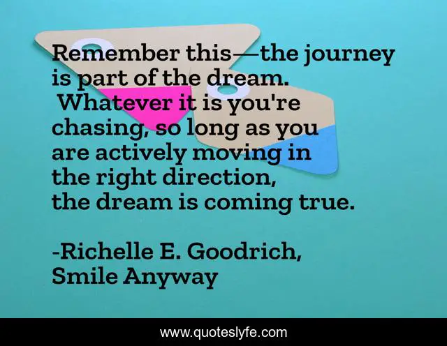 This page presents the quote "Remember this—the journey is part of the dream. Whatever it is you're chasing, so long as you are actively moving in the right direction, the dream is coming true.". Author of this quote is Richelle E. Goodrich, Smile Anyway. This quote is about perserverance, ambitions, richelle, goals, richelle-goodrich, dreams,.