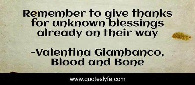 This page presents the quote "Remember to give thanks for unknown blessings already on their way". Author of this quote is Valentina Giambanco, Blood and Bone. This quote is about blessings, thanks, thanksgiving,.