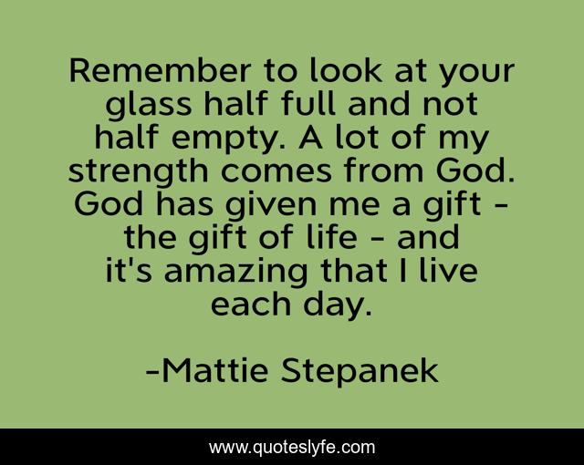 This page presents the quote "Remember to look at your glass half full and not half empty. A lot of my strength comes from God. God has given me a gift - the gift of life - and it's amazing that I live each day.". Author of this quote is Mattie Stepanek. This quote is about god, life, day,.