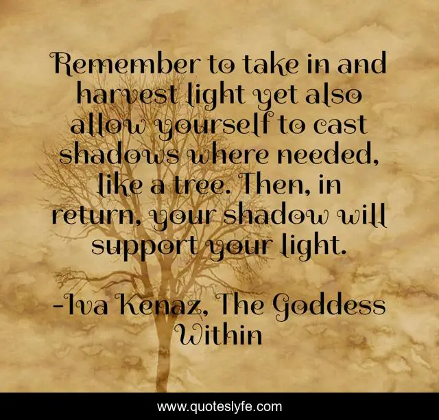 This page presents the quote "Remember to take in and harvest light yet also allow yourself to cast shadows where needed, like a tree. Then, in return, your shadow will support your light.". Author of this quote is Iva Kenaz, The Goddess Within. This quote is about fantasy-romance, goddess, fantasy-fiction, spiritual, inspirational, fantasy-young-adult, enthusiasm,.